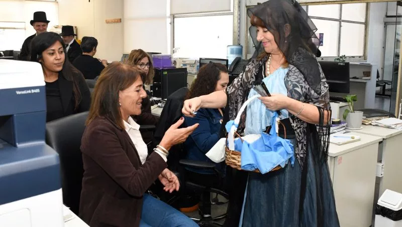En el marco del Día de la Escarapela, que se celebra el 18 de mayo, la Municipalidad organizó una intervención artística con los alumnos del Espacio Teatral de Guaymallén, que se caracterizaron como Domingo French y Antonio Beruti y sus esposas, para realizar el reparto de insignias a vecinos y empleados presentes en el edificio municipal.