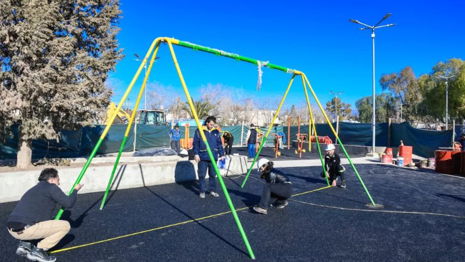 Actualmente las tareas se focalizan en la instalación de su piso antiimpacto formulado con caucho continuo, un novedoso material que supera rigurosas pruebas de seguridad, garantizando protección contra impactos. El mismo estará destinado a las áreas de juegos infantiles y pista de salud.
