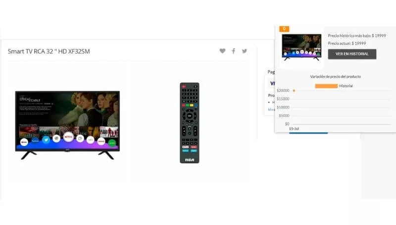 Esta vez, para ejemplificar, usamos otra conocida tienda de electrónica que tiene presencia en todo el país, el producto elegido un Smart TV RCA 32”. El precio actual (al 27 de julio) es de $ 21.999, pero cuenta con un “descuento” del 9%, lo que deja al equipo en $ 19.999. Utilizando “Historial” comprobamos que dicho descuento no existe, por lo que el precio ofrecido es el mismo, no tiene ninguna rebaja.