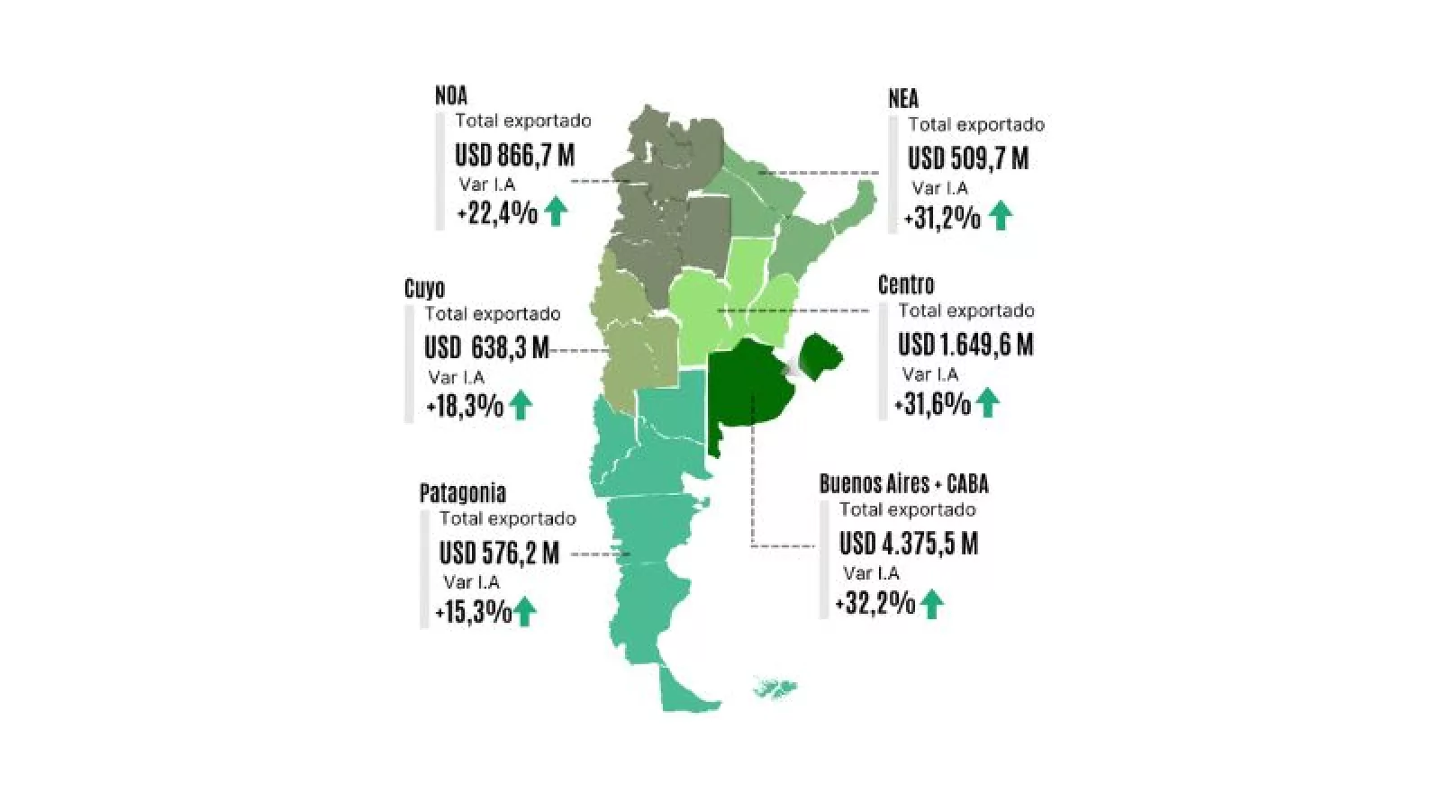 Con este incremento, las exportaciones regionales alcanzaron los US$ 8.649 millones exportados en el período octubre 2023-septiembre 2024, habiendo importado US$ 791 millones, lo que arroja un superávit comercial de US$ 7.858 millones.