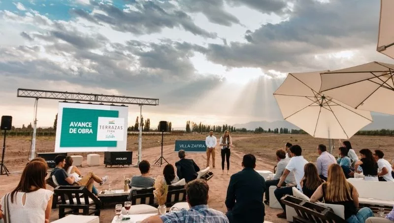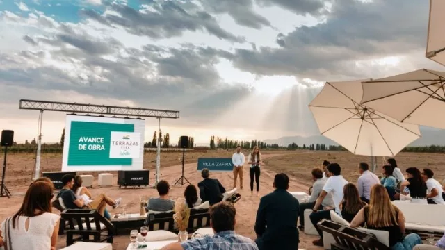El avance de obra se llevó a cabo en un sunset súper relajado en donde los futuros vecinos disfrutaron de música, gastronomía, exquisitos vinos y por supuesto una increíble vista a la Cordillera de Los Andes. Fue allí donde los futuros vecinos además de conocer en detalle el avance de obra del barrio, pudieron pisar sus terrenos y recorrer el barrio junto a su familia.