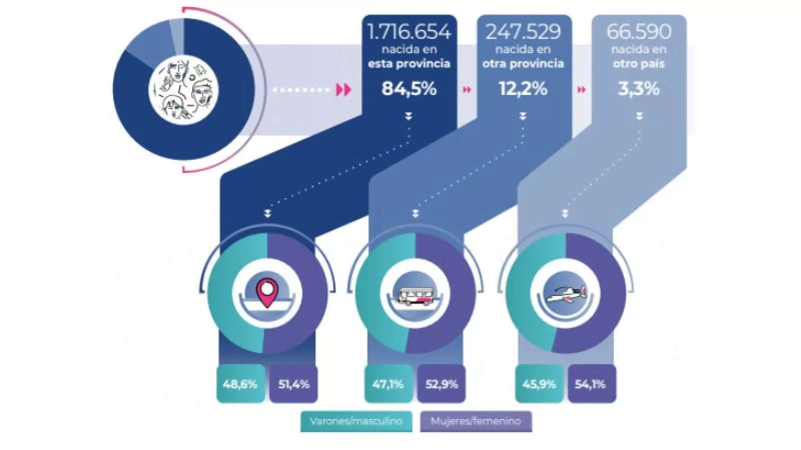En tanto, casi 8 millones de los argentinos viviendo en el país nacieron en un distrito (provincia) diferente al que viven en la actualidad, es decir, una tasa de migración interna del 17,5%.