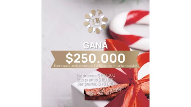 La Barraca Mall ha preparado importantes premios en pesos para el festejo de Navidad. Hasta el 24 de diciembre habrá sorteos por $250 mil en cheques, que se van a repartir entre tres ganadores: el primero se llevará $100 mil, para el segundo ganador habrá una chequera de $80 mil y para el tercer premio, $70 mil.