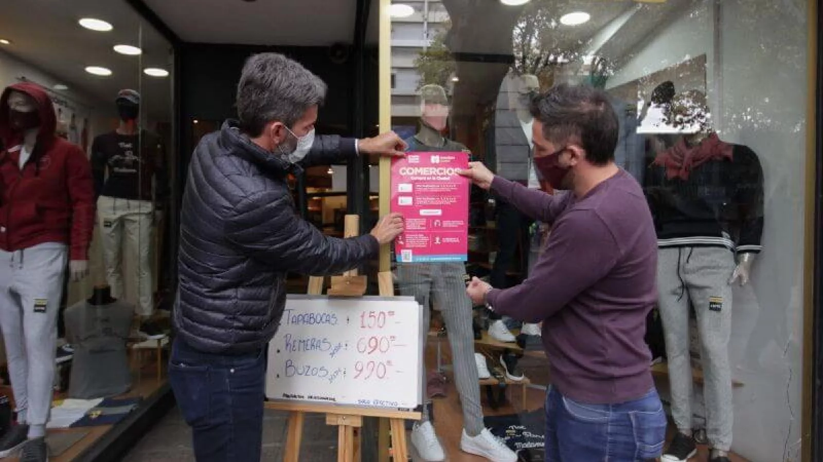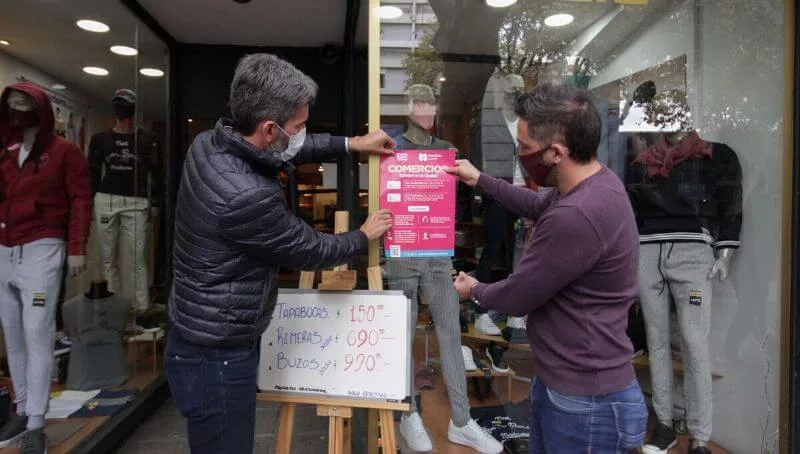 Ulpiano Suárez también estuvo recorriendo el microcentro, visitando los distintos comercios. Dialogó con los dueños de los negocios, y colocaron juntos cartelería con información sobre los protocolos sanitarios, en las vidrieras y los accesos a los locales comerciales.