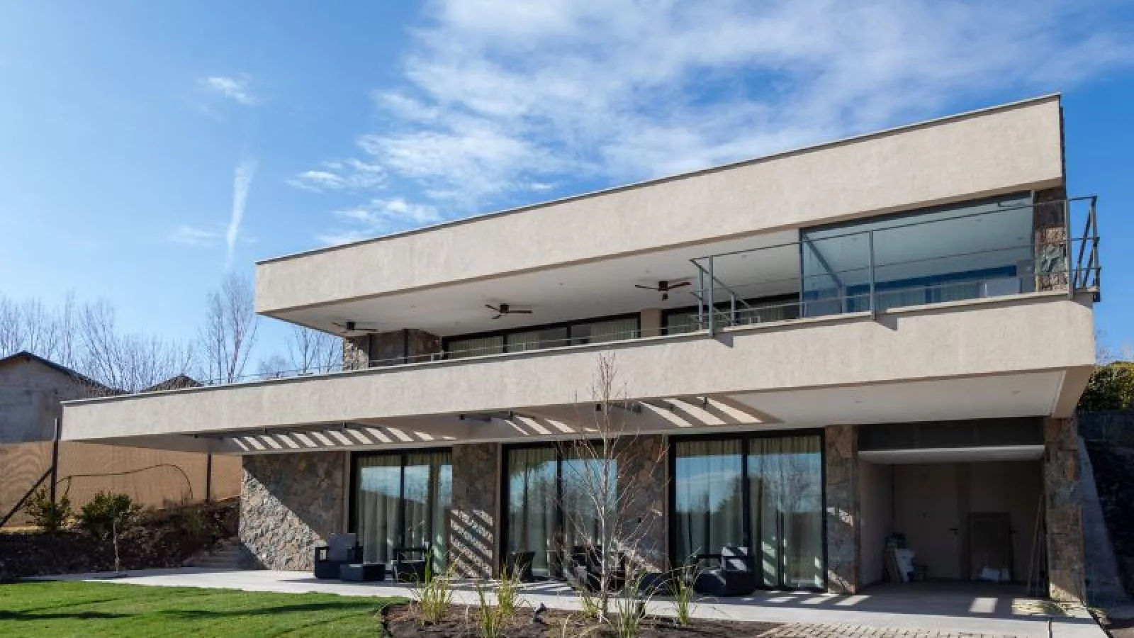 La casa se organiza en dos niveles, con el acceso principal ubicado en la cota superior del terreno, lo que permite un recorrido espacial progresivo y una lectura volumétrica contundente desde el exterior. El diseño se apoya en volúmenes puros y líneas rectas, combinados con muros revestidos en piedra natural, generando una imagen sólida y a la vez cálida, en equilibrio entre lo moderno y lo orgánico.