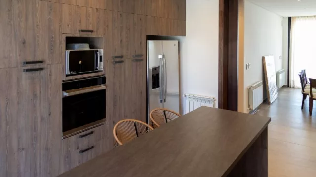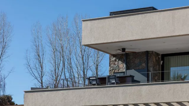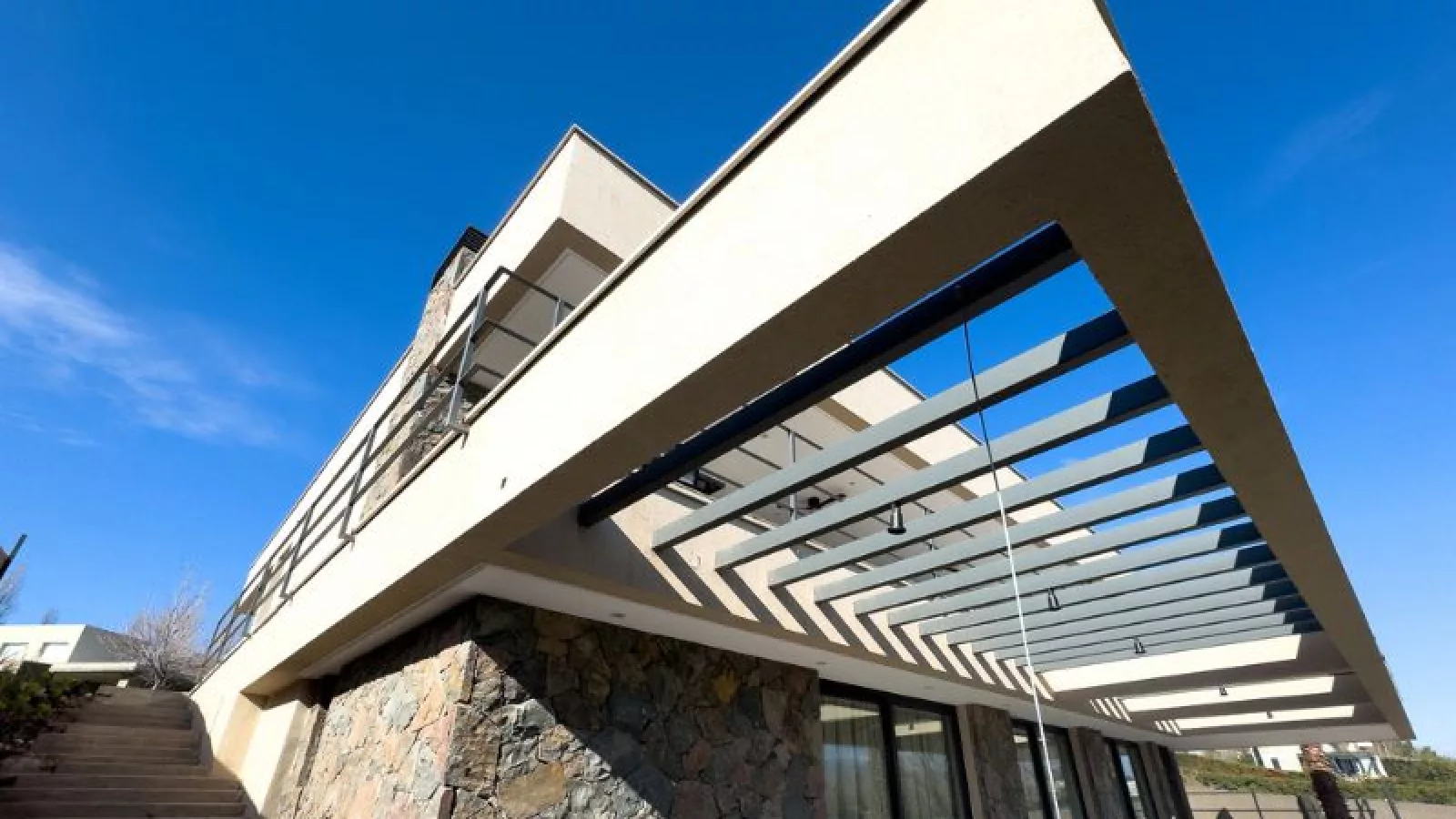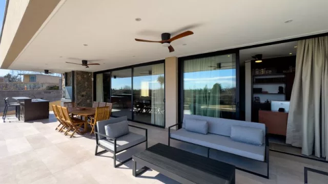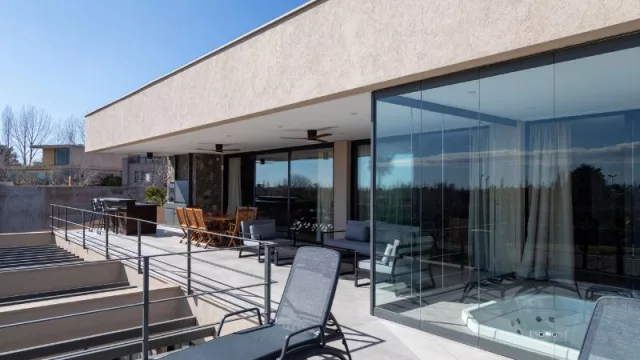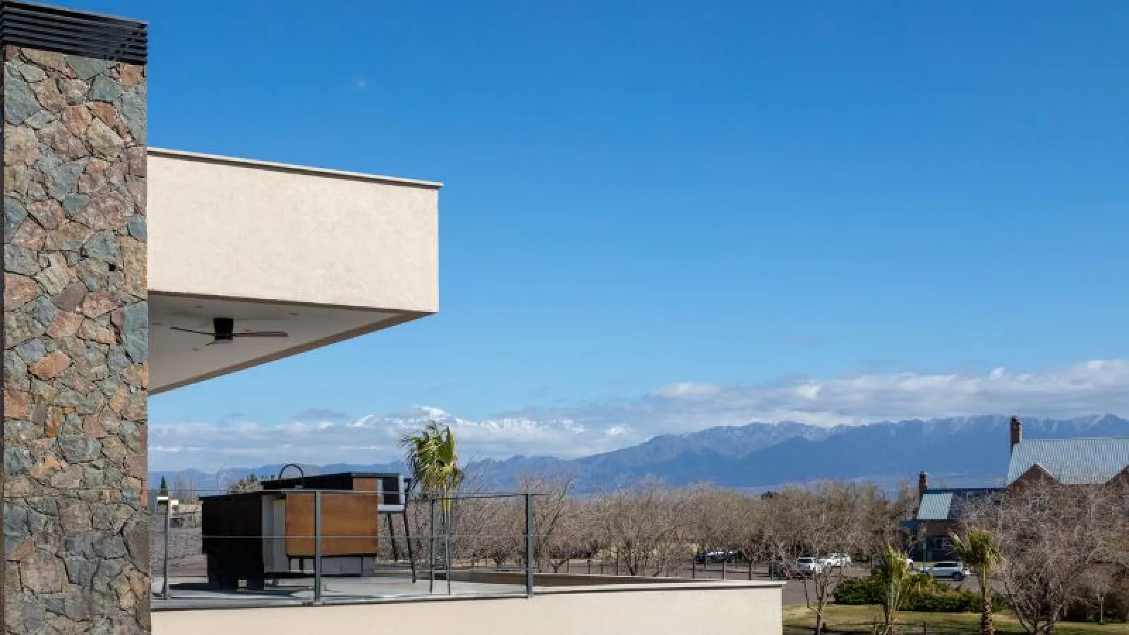 En la planta alta, una gran galería cubierta funciona como mirador hacia la cancha de golf y el paisaje circundante. Allí se ubican el asador y el comedor exterior, pensados como espacios de encuentro y uso permanente. En este nivel también se desarrolla el área privada, con un living-comedor integrado a la cocina y una suite principal que se abre a una galería con jacuzzi y vistas a la montaña.