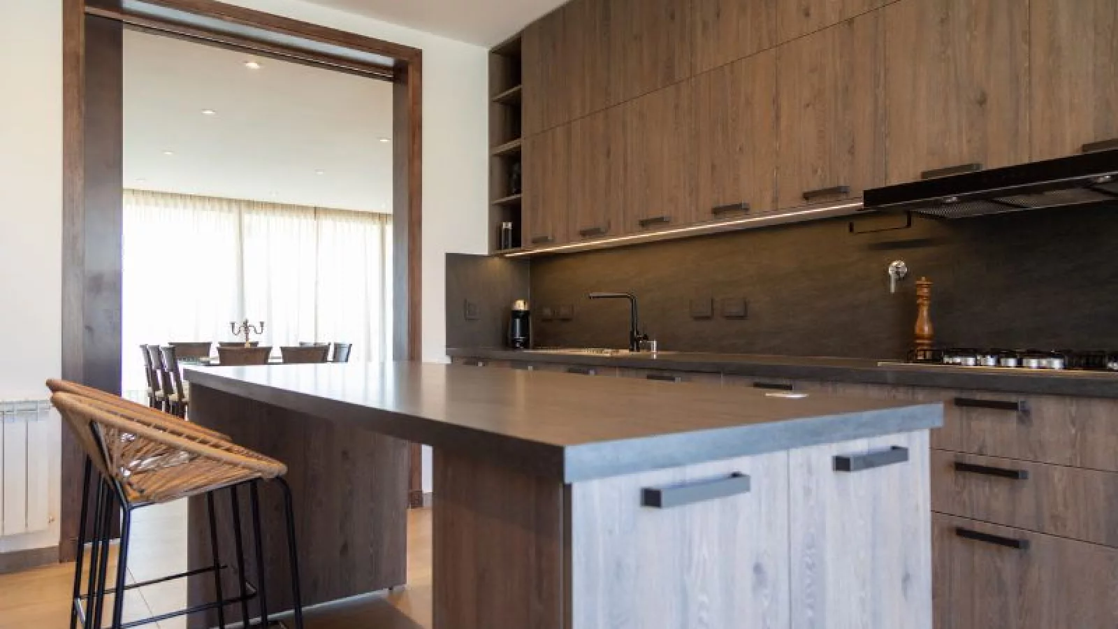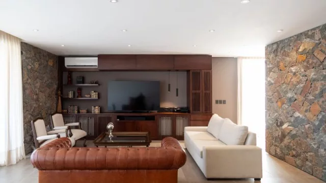 En el interior, los espacios sociales se vinculan de manera directa con el exterior a través de amplios ventanales corredizos, que conectan la planta baja con una terraza protegida por una pérgola metálica. Los pavimentos en tonos neutros, la presencia constante de la piedra y el mobiliario en madera oscura refuerzan una atmósfera serena y coherente en toda la vivienda.