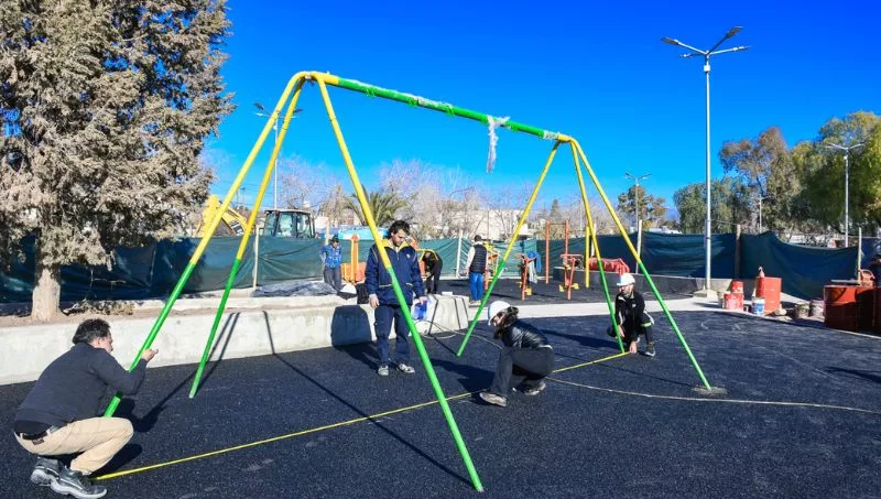 Actualmente las tareas se focalizan en la instalación de su piso antiimpacto formulado con caucho continuo, un novedoso material que supera rigurosas pruebas de seguridad, garantizando protección contra impactos. El mismo estará destinado a las áreas de juegos infantiles y pista de salud.
