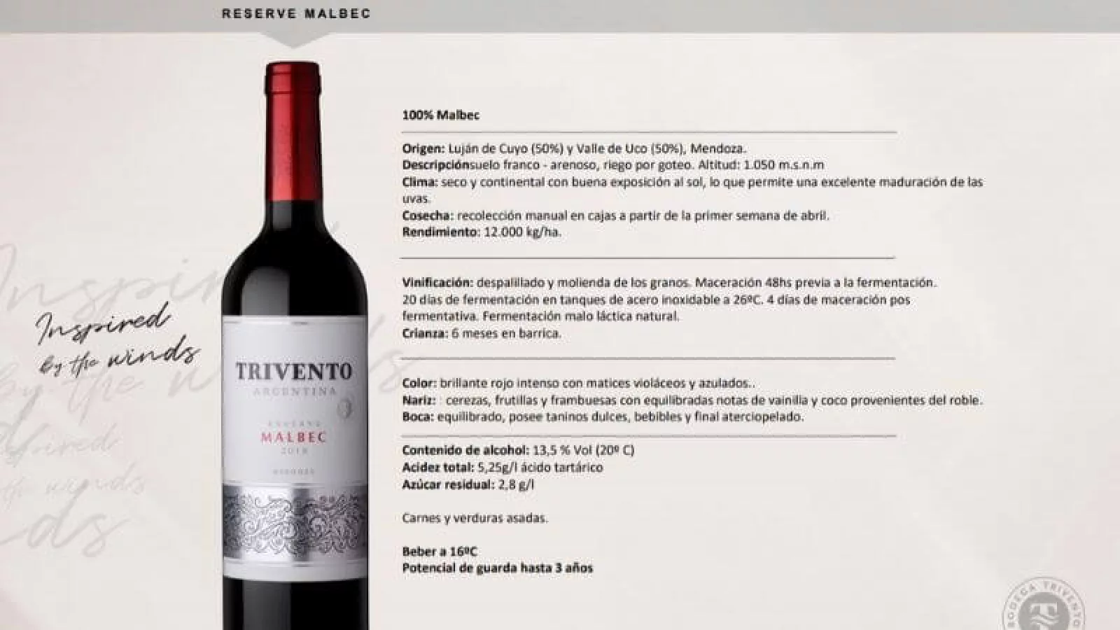 Desde 2013 la marca “Trivento Reserve” (Made in Mendoza) es el vino más elegido por el consumidor europeo y cuenta con la mayor distribución global, llegando a más de 100 mercados en el mundo. Allí el malbec es el que marca la diferencia y además ha recibido excelentes puntajes por parte de los críticos especializados, los cuales rondan entre los 90 y 92 puntos, incluso en la cosecha 2019, que ya se está distribuyendo desde hace unas pocas semanas.