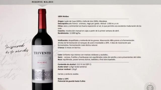 A este Trivento Malbec Reserva (2019) le dio 92 puntos y lo describió así: “Tiene un carácter afrutado, que recuerda a una canasta de bayas frescas, así como algunas ciruelas y hierbas. De cuerpo medio con acidez saludable y un tiempo agradablemente largo. Acabado refrescante. Cremoso. Concreto. Para beber ahora”