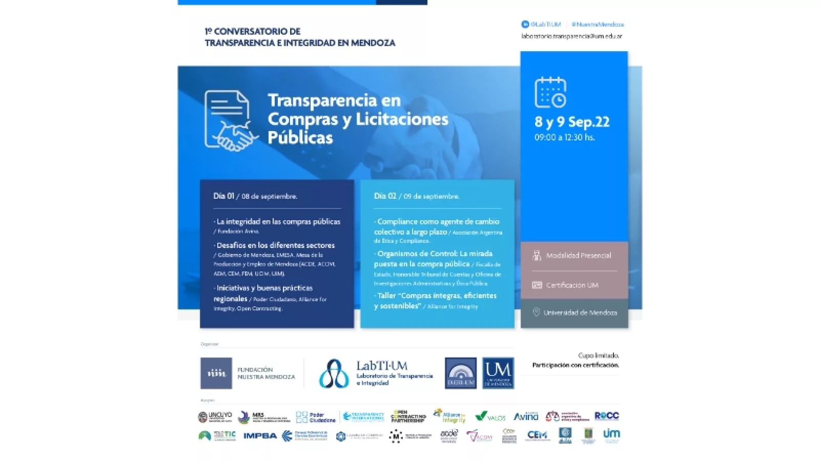 El 1° Conversatorio se desarrollará en dos jornadas, el jueves 08 y viernes 09 de septiembre, de las 09:00 a las 12:30 hs. Es un evento gratuito que requiere inscripción previa y otorga a los participantes certificación de la Universidad de Mendoza.