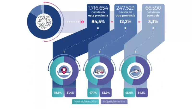 En tanto, casi 8 millones de los argentinos viviendo en el país nacieron en un distrito (provincia) diferente al que viven en la actualidad, es decir, una tasa de migración interna del 17,5%.
