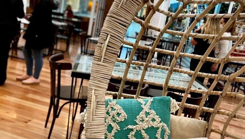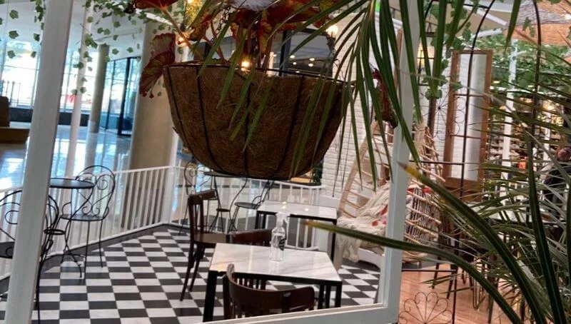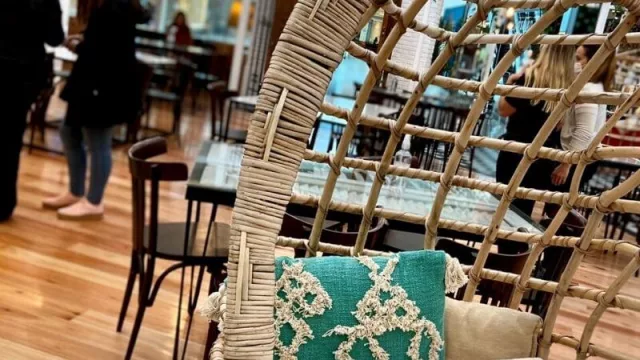 La casa de café en Palmares se emplaza en la última cúpula de la nueva construcción del mall, en un espacio circular que simula con patio coqueto con verdes y mucha iluminación donde se puede disfrutar de la propuesta desde un café hasta una cena en mesas, en la barra, en livings o en hamacas.
