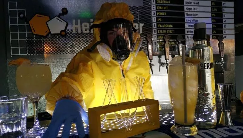 Por el lado de afuera, en el ingreso, están las mesas intercaladas con barriles negros con la figura de una abeja amarilla, que evocan a los que contenían los químicos de Walter. Adentro, hay una barra llena de pipetas, de tubos de ensayos, de luces led, de tuberías, de máquinas de humo, de un ambiente de nieblas, que simulan ser la fábrica donde el personaje hacía sus mezclas que lo llevaron a conocer el mundo del narcotráfico.