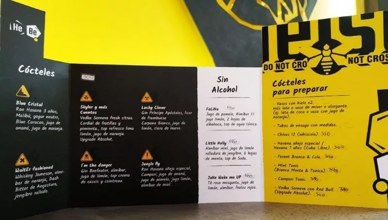 Hay también un maletín lleno de papeles que imitan dólares, que en la inauguración (el 8 de octubre), se repartieron a los clientes, y que tenían como finalidad intercambiarlos por diferentes tragos. Pero hay más. Los mozos atienden con los típicos mamelucos amarillos de la serie y máscaras de laboratorio. Todo está pensado, nada sobra en el lugar. Hasta la carta para elegir lo que se va a consumir, es un lujo. El nombre del bar alude al seudónimo que usaba el protagonista en el mundo del contrabando de drogas: Heinseberg, y para jugar un poco con la cerveza le pusieron Heisenbeer.