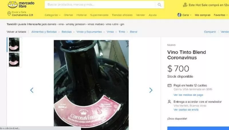 Coronavinus, “solo una letra cambia el miedo por placer” reza el eslogan de la damajuana sanjuanina que se vende online por Mercado Libre, perteneciente a la Bodega Villa Borja de la localidad de Rawson.