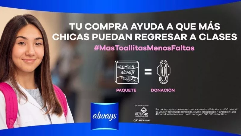 Ante esta situación, desde el 2019 Always ha puesto en marcha en Argentina la campaña “Más toallitas menos faltas” en la que, gracias al apoyo de la Fundación Ruta 40 y Fundación Andreani, la marca colabora con toallitas a escuelas rurales de todo el país con el fin de que menos niñas pierdan días de clases. Gracias a las últimas dos ediciones, la empresa logró donar más de dos millones de toallitas a más de 10.000 niñas de Argentina. Esta acción se enmarca dentro de la campaña regional de P&G #ActuemosUnidos, parte del esfuerzo global “Lead With Love” en la que la empresa se compromete a realizar durante este nuevo año 2021 acciones con un impacto positivo en las comunidades y medio ambiente.