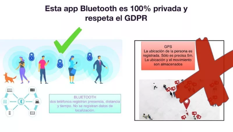 Tal cual lo dice el entrevistado, esta aplicación no recolecta ni utiliza la información de ubicación ni accede a la lista de contactos del usuario. Utiliza el servicio de Bluetooth para conectarse con otros dispositivos cercanos y no almacena información sobre dónde ocurre el contacto. Sólo almacena la distancia del dispositivo conectado y la cantidad de tiempo que estuvo cerca, el propósito es para calcular el nivel de riesgo posteriormente.