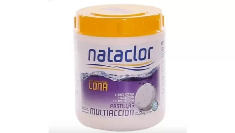 Uno de ellos es Cloro Multiacción en pastillas de 50 gs, para poner en una boya una pastilla cada 5000 litros de agua semanal.