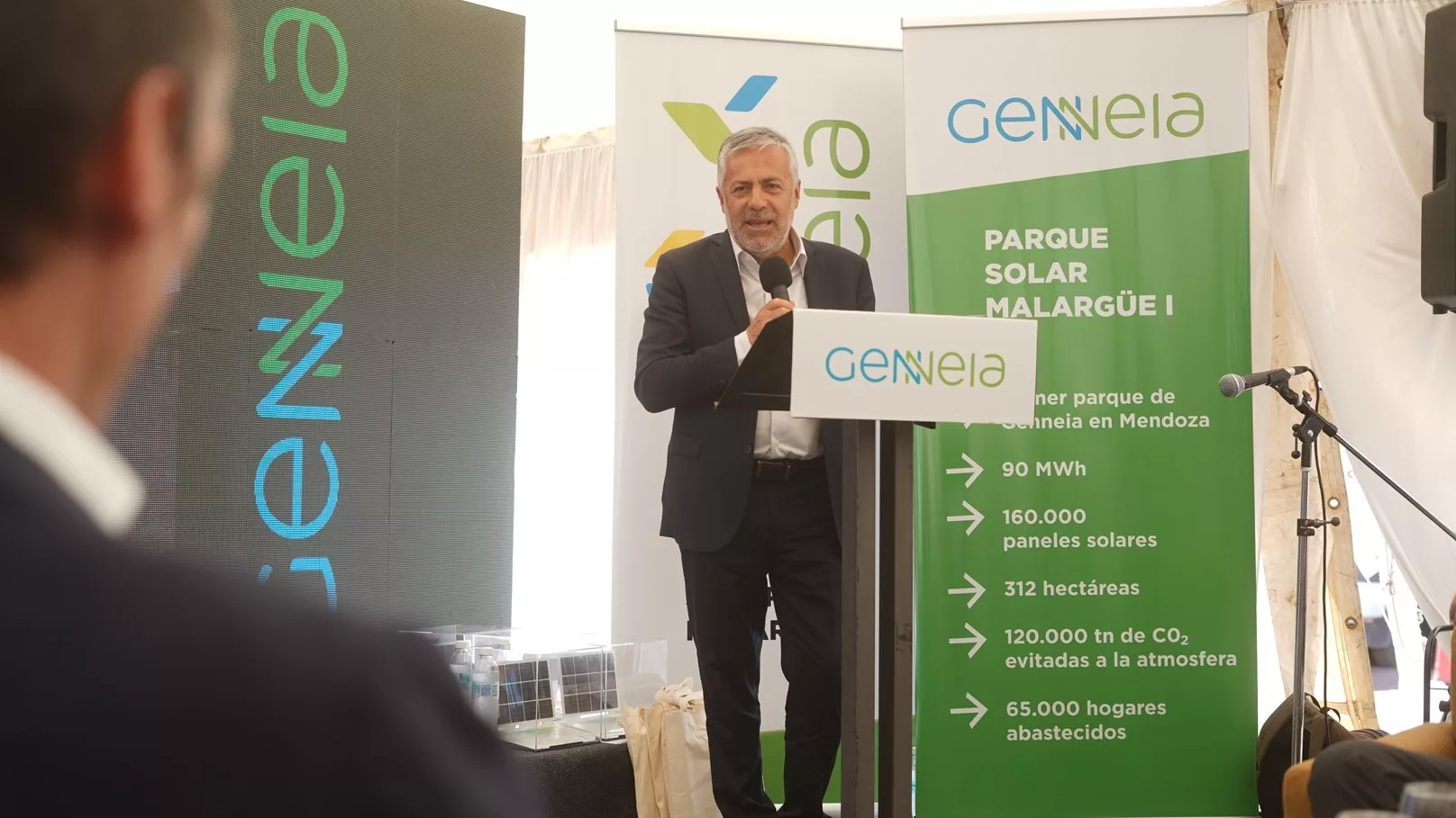 Durante el acto, los representantes de la compañía anunciaron, además, la construcción de un nuevo parque solar en San Rafael, con capacidad de 150 MW y una inversión de 150 millones de dólares. Estuvieron presentes el equipo directivo de Genneia, encabezado por Jorge Brito, uno de sus accionistas principales; César Rossi, presidente; Bernardo Andrews, CEO; representantes del resto de los accionistas y directivos.