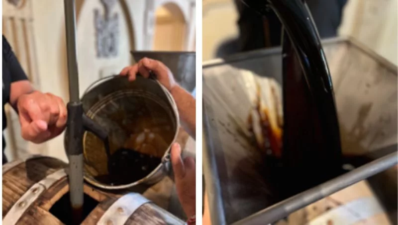 Este año se realizará la molienda de 4500 kg de uva de la variedad Ugni Blanc para elaborar el nuevo mosto virgen que, tras ser reducido a fuego lento para concentrarlo un 30%, permanecerá alejándose hasta el año próximo cuando será trasvasado a otra barrica, continuando el meticuloso proceso.
