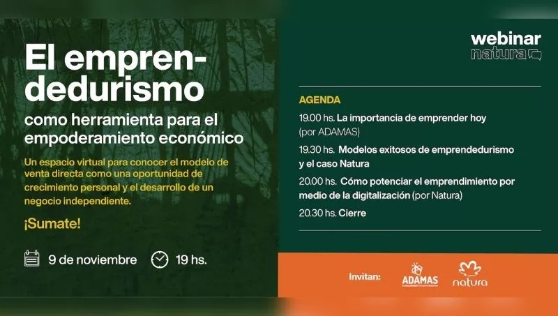ADAMAS y Natura Argentina invitan, el martes 9 de noviembre a las 19hs., a participar del primer evento gratuito que realizan en conjunto sobre el emprendedurismo como herramienta para el empoderamiento económico. Un espacio virtual para entender la importancia de emprender y conocer el modelo de la venta directa como una oportunidad de crecimiento personal y desarrollo de un negocio independiente.