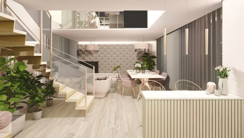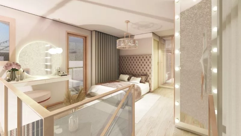 Su materialidad busca rebosar lujo y carácter, con sus toques de originalidad que aportan cada uno de sus elementos constructivos: hormigón pigmentado en rosa gold con toques perlados; parasoles de acero microperforado pulido; pisos de porcelanato antideslizante; espacios con doble altura; dormitorio dentro de un vestidor de alta gama, con balconeo a espacio de estar-comedor; espacios espejados; grandes ventanales.