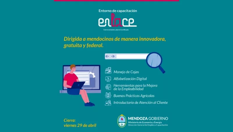 El 29 de abril cierran  las inscripciones para capacitarse en empleos de forma virtual. Se trata de las propuestas de la plataforma Enlace. Son cinco propuestas totalmente gratuitas, con interfaz amigable para un acceso sencillo e interesantes contenidos que permitirán mejorar la empleabilidad de los mendocinos.