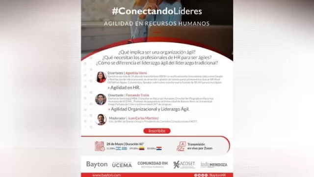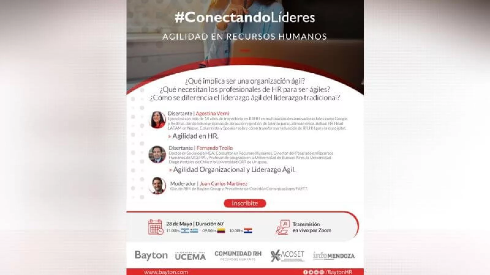 Bayton junto a la UCEMA, Comunidad RH y ACOSET realizará este jueves 28 a partir de las a las 11 horas el primer Conectando Líderes Agilidad en RRHH, que será un webinar de una hora para Argentina, Uruguay, Colombia y Paraguay con el objetivo de charlar sobre Agilidad en el mundo de los RRHH.