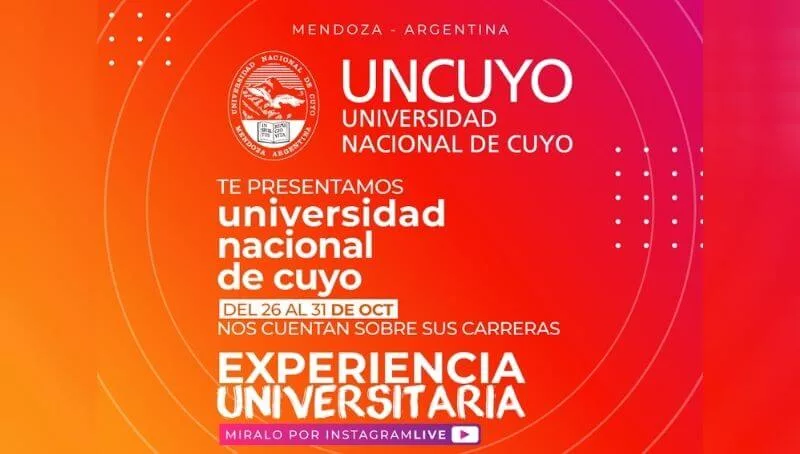 En el marco de la campaña “Mendoza para vivir, Mendoza para estudiar 2021”, Ciudad U! Impulsa la Experiencia Universitaria, una iniciativa pensada para difundir la oferta educativa superior de la provincia. De octubre a noviembre, se brindará un ciclo de charlas virtuales con instituciones académicas locales para conocer sobre sus carreras y experiencias. A lo largo de esta semana, será la Universidad Nacional de Cuyo (UNCuyo) la encargada de exponer sobre sus propuestas vocacionales.