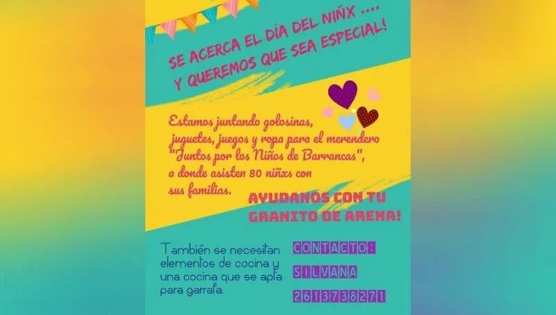 “Si bien hoy no podremos abrazarnos, sí podemos ayudar”, es la premisa de la campaña solidaria, que apunta a colaborar con 260 niños de Las Heras y Guaymallén. Específicamente beneficia a los chicos que concurren a los comedores comunitarios Corazón de Jesús (El Pastal, Las Heras) y Santa Rita, situado en Colonia Segovia de Guaymallén.