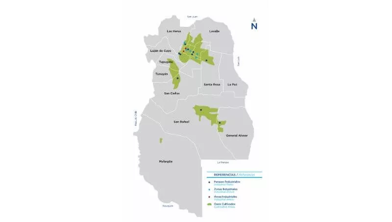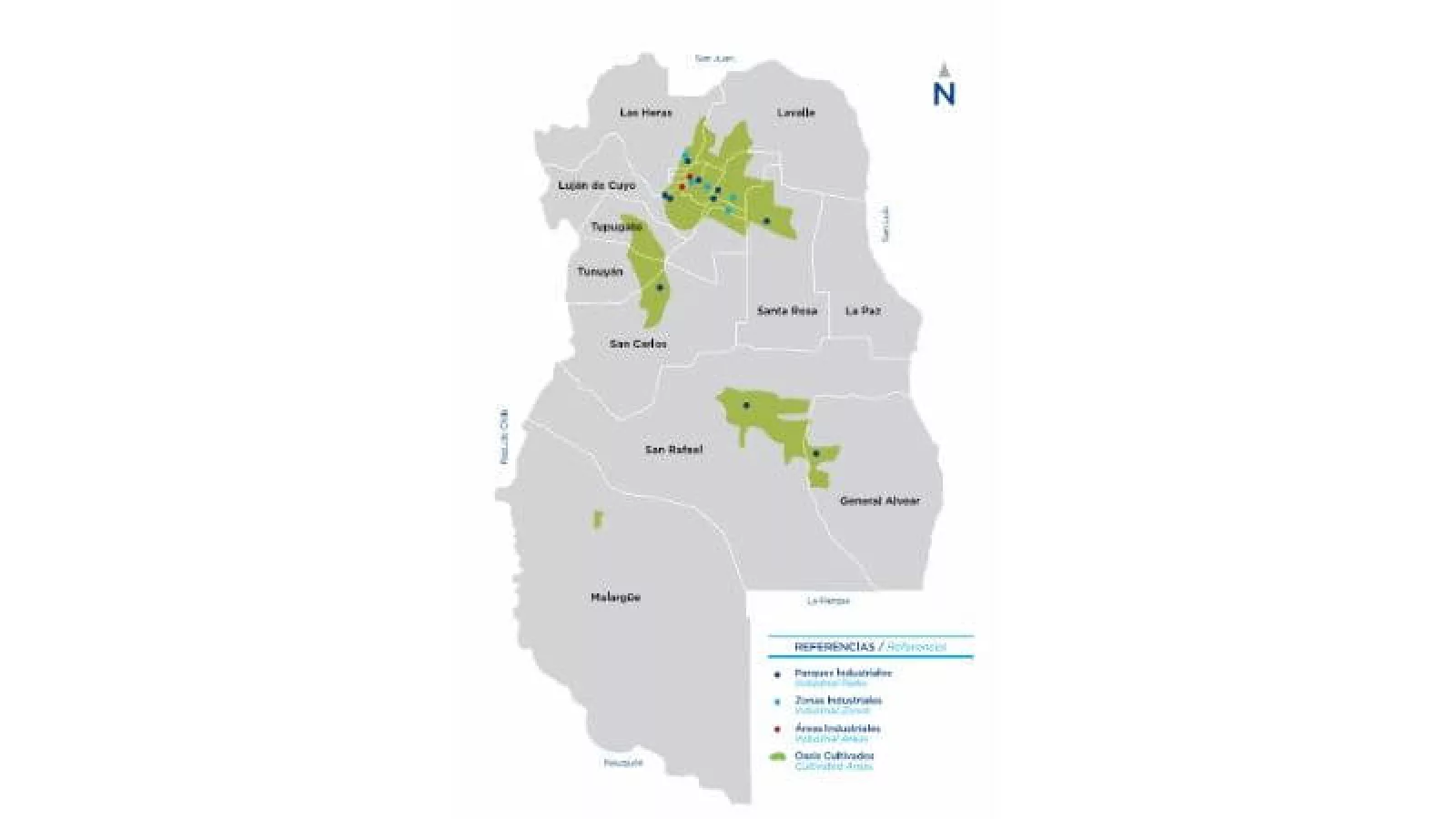 La provincia de Mendoza cuenta con 13 parques industriales de administración pública distribuidos en toda la provincia, 8 ya en funcionamiento y 5 en desarrollo.