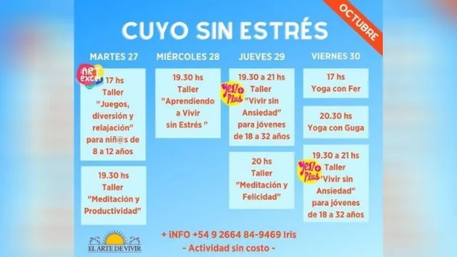 “Cuyo sin estrés” se trata de varias actividades gratuitas, en diferentes horarios en los que cada uno puede sumarse entre el 27 y el 30 de octubre.