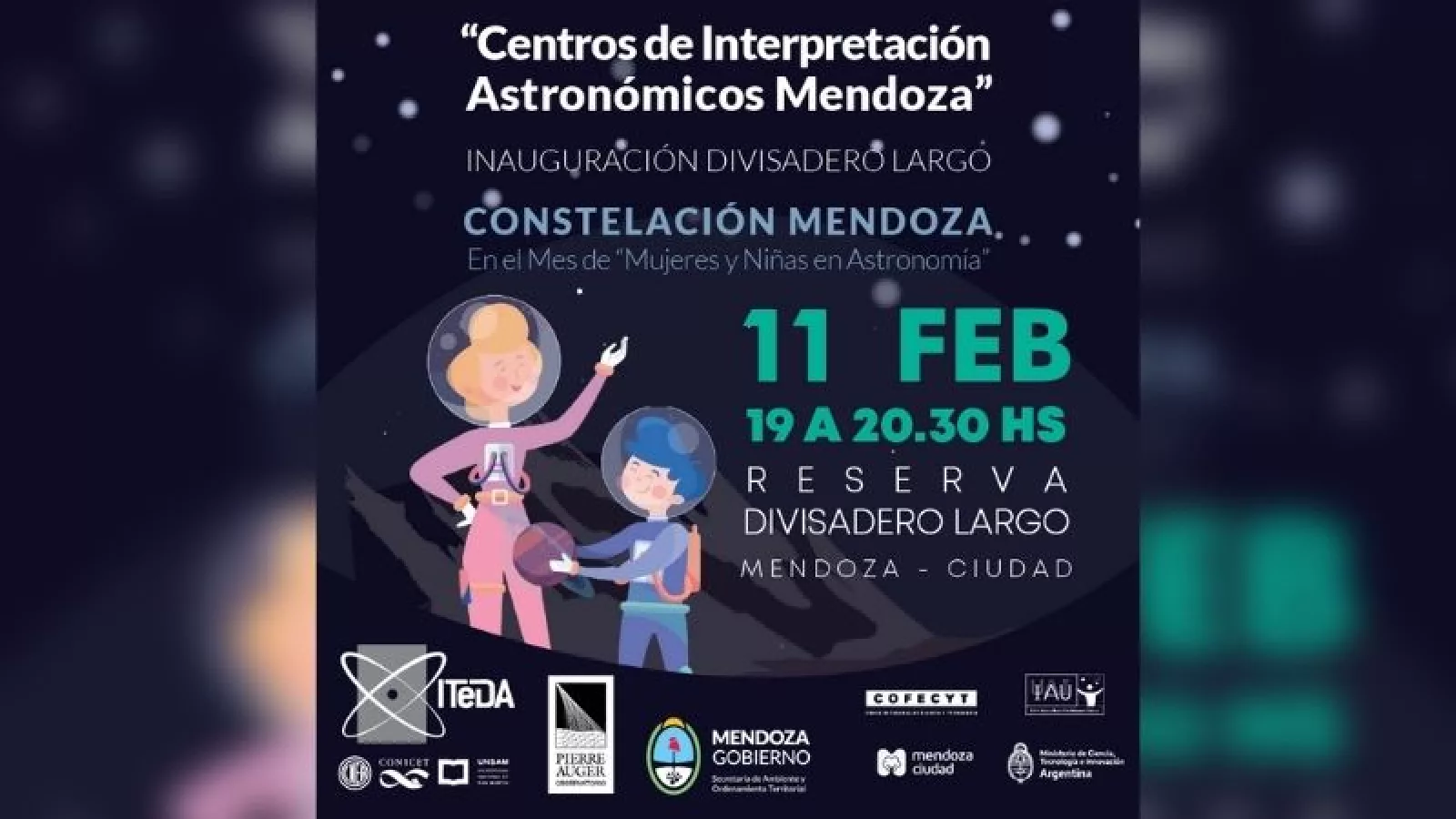 La inauguración del segundo centro de interpretación del proyecto se realizará el viernes 11 de febrero, desde las 19, en la Reserva Natural Protegida Divisadero Largo. Se instalará el material correspondiente, se entregará telescopio y se realizará una actividad de observación abierta al público desde las 19 hasta las 20.30. Todo esto en el marco de Constelación Mendoza y de las actividades astronómicas internacionales que se llevarán a cabo en todo el mundo en conmemoración del Mes de Mujeres y Niñas en Astronomía. Estas actividades cuentan con el apoyo de la Unión Astronómica Internacional (https://www.iau.org/public/women-and-girls-in-astronomy/)