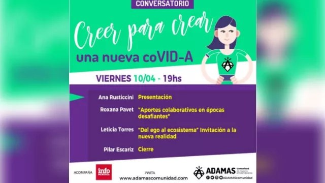 Este Viernes 10 de Abril a las 19 hs, por Zoom Cloud meetings, se realizará la segunda parte del Conversatorio “Creer para crear una nueva coVID-A”, una actividad pensada por la Asociación ADAMAS -Comunidad de Mujeres Emprendedoras-, para verle el lado positivo a estos tiempos desafiantes: “ de esto salimos como diamantes, más fuertes, más brillantes y con mucho más valor”, explican.