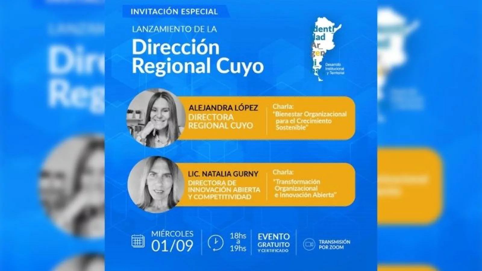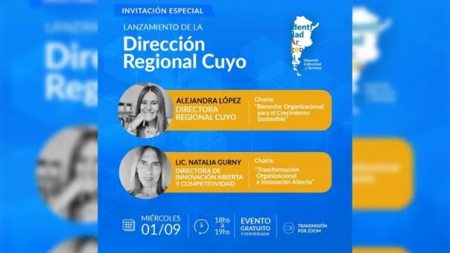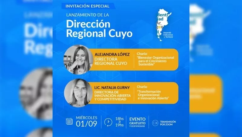 De esta manera, tendrá lugar la charla "Bienestar organizacional para el Crecimiento Sostenible" a cargo de la Lic. Alejandra López, directora Regional Cuyo y "Transformación organizacional e innovación abierta" a cargo de la Lic. Natalia Gurny, directora de Innovación Abierta y Competitividad de Identidad Argentina.