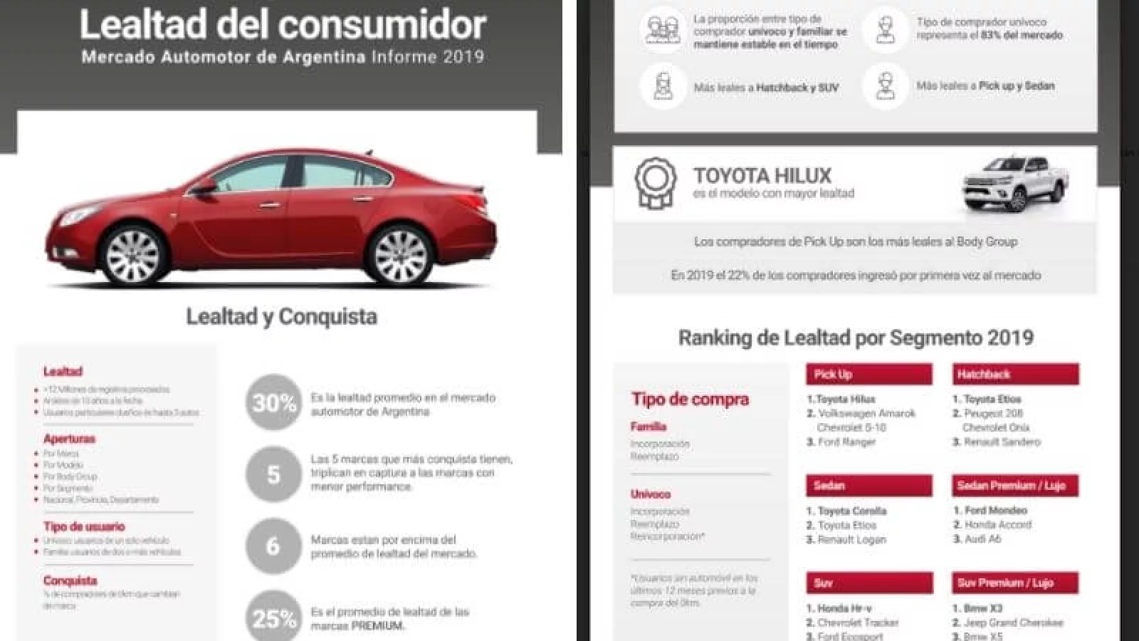 El índice 2019 arrojó que el tipo de comprador unívoco representa el 83% del mercado, mientras que 30% es la cantidad de la lealtad promedio en el Mercado Automotor de Argentina. Además, son 5 las marcas que más conquista tienen, triplicando en captura a las marcas menos performance.