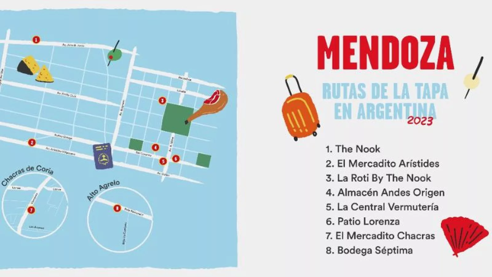 En Mendoza participan: Almacén Andes Origen, El mercadito de Aristides, Espacio Culinario Séptima, The nook,  Mercadito Chacras,  Patio Lorenza,  La Roti by The nook, y La Central Vermutería. A modo de ejemplo, las opciones de tapas de Almacén Andes Origen son Croquetas de chivo, Trío de empanadas o Queso de cabra grillado y ensaladita verde junto a la bebida: lata de cerveza Andes Origen, gaseosa o agua, por un valor por persona $ 2300. El Mercadito Chacras tendrá 3 opciones: brusquetas de morcilla, cebollita de verdeo y manzana verde; mini albóndigas de ternera fritas en salsa de tomates y hierbas de la huerta o pinchos de melón con jamón crudo todos acompañados de Carpano rosso o Pinta de Stella o copa de vino en un promedio de $ 2000.