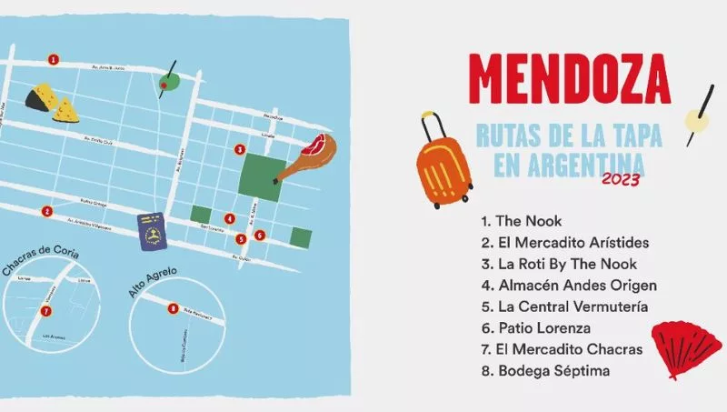En Mendoza participan: Almacén Andes Origen, El mercadito de Aristides, Espacio Culinario Séptima, The nook, Mercadito Chacras, Patio Lorenza, La Roti by The nook, y La Central Vermutería. A modo de ejemplo, las opciones de tapas de Almacén Andes Origen son Croquetas de chivo, Trío de empanadas o Queso de cabra grillado y ensaladita verde junto a la bebida: lata de cerveza Andes Origen, gaseosa o agua, por un valor por persona $ 2300. El Mercadito Chacras tendrá 3 opciones: brusquetas de morcilla, cebollita de verdeo y manzana verde; mini albóndigas de ternera fritas en salsa de tomates y hierbas de la huerta o pinchos de melón con jamón crudo todos acompañados de Carpano rosso o Pinta de Stella o copa de vino en un promedio de $ 2000.