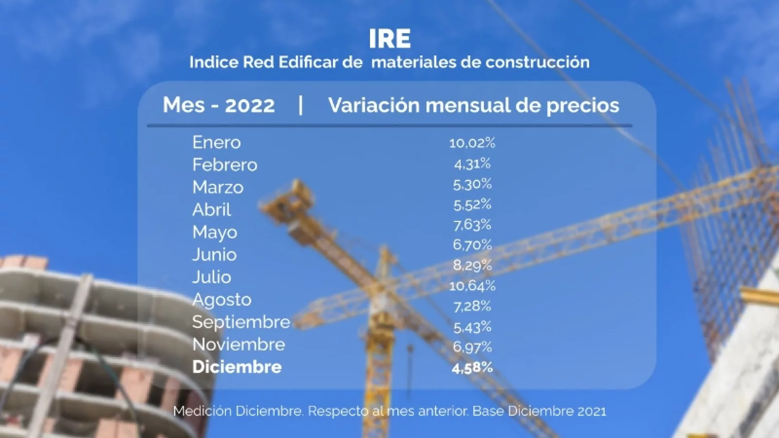 El IRE (Índice Red Edificar), dio como resultado que el valor de diciembre con respecto a noviembre fue del 4,58% registrando una significativa caída en relación del mes anterior que había sido casi del 7%.