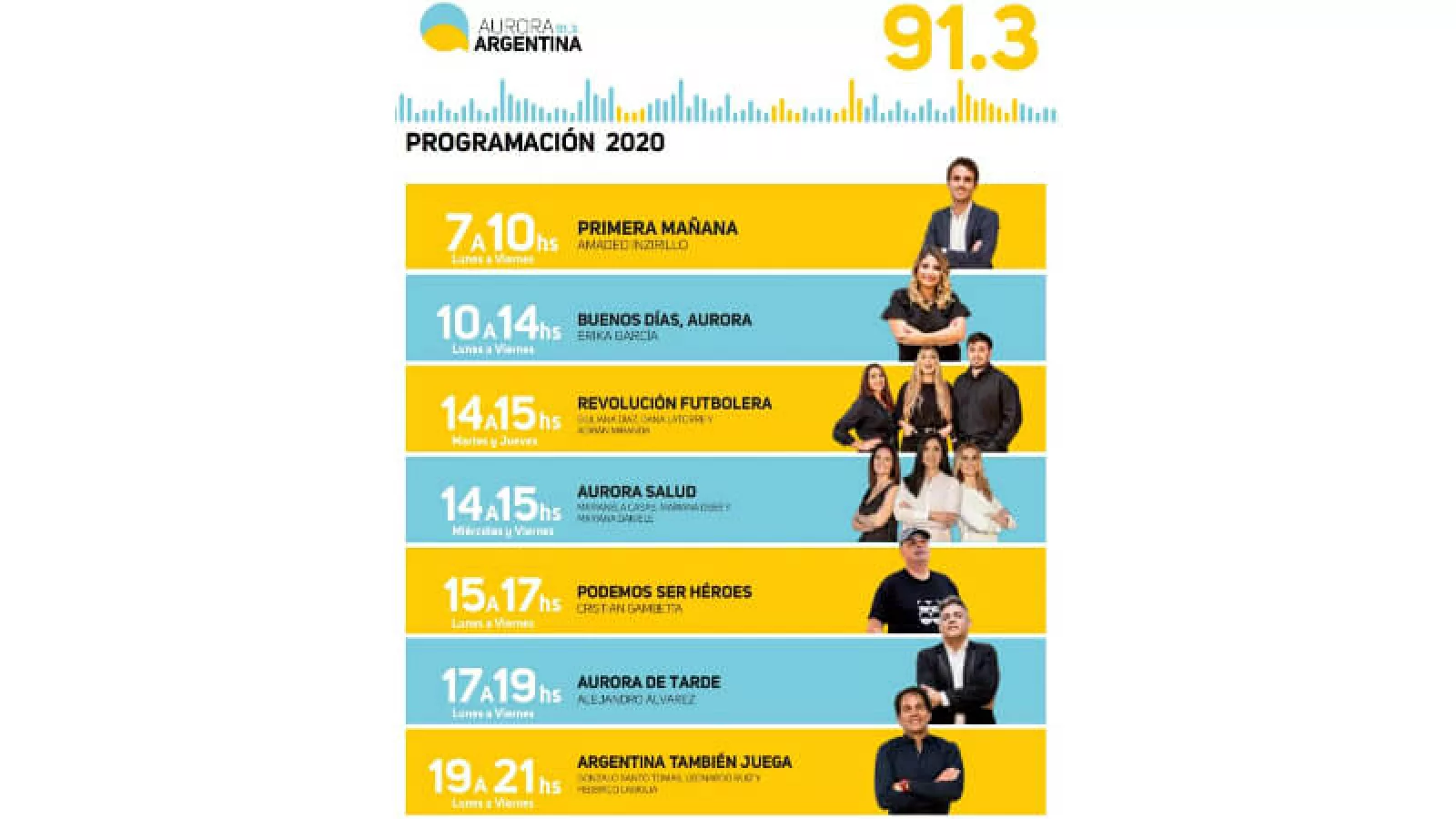 - “Podemos ser héroes”, de 15 a 17h, con la conducción de Cristian Gambetta. El rock y el pop tienen su lugar en Aurora. Buena música, anécdotas e historias, pasando por todos los géneros musicales asociados y derivados del movimiento que nació en los ´50 en EEUU, y que va tomando identidad propia en cada rincón del mundo donde se disfrute.