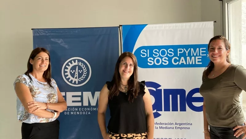 Alfredo Cecchi, Presidente de la Federación Económica de Mendoza (FEM); Fernanda Reina, Secretaria Adjunta de Mujeres Empresarias de la Confederación Argentina de la Mediana Empresa (MECAME) y Presidenta de Mujeres Empresarias y Emprendedoras de la FEM; Sonia Turesso, Comisión Directiva de la Asociación Civil Cámara de Mujeres Empresarias y Emprendedoras de Mendoza; Graciela Rovera, Coordinadora Regional Cuyo de MECAME y Presidenta de la Comisión de Comercio Exterior de la FEM; Graciela Funes, Vicepresidenta de la Cámara de Comercio, Industria y Agricultura de Gral. San Martín, Presidenta del área de comercio y Mujer Empresaria de Mendoza 2021 y Emilce Vega Espinoza, Directora Territorial de Empleo y Capacitación, Ministerio de Economía y Energía,  Gobierno de Mendoza.