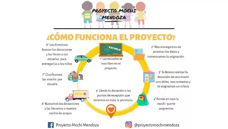 El proyecto Mochi tiene como objetivo conseguir mochilas con útiles para niños en situación de vulnerabilidad puedan comenzar sus clases con todo lo necesario. Las mochilas están clasificadas según la edad del niño y la demanda escolar.