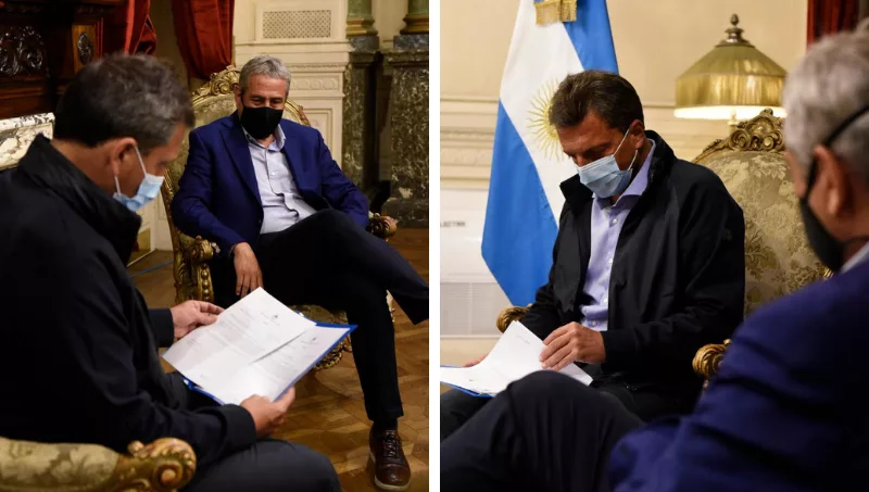 El presidente de Diputados, Sergio Massa, y el titular de la cartera de Desarrollo Territorial y Hábitat de la Nación, Jorge Ferraresi, compartieron una reunión de trabajo en la que el ministro le presentó el proyecto del Ejecutivo nacional que prevé la construcción de 55 mil viviendas. Del encuentro, que se realizó en el Salón de Honor de la Cámara baja, también participó el secretario de Hábitat, Santiago Maggiotti.