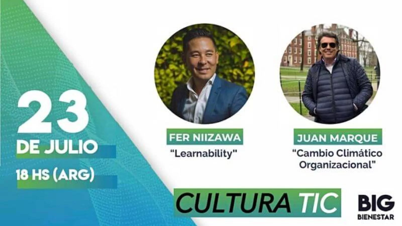 Durante esta MasterClass Fer Niizawa, experto en gestión humana, junto a Juan Marque, CEO de BIG Bienestar; desarrollarán las competencias y contextos a considerar para potenciar tu talento en la era digital.