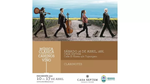 El próximo sábado 16 de abril, desde las 18 h, el ciclo “Música Clásica por los Caminos del Vino” llega a Casa Septiem, el complejo turístico de la Desarrolladora Ciofi. El evento contará con el show de Clarinotes, DJ Fabu y Puna Music, mientras que se podrá degustar una gran gama de vinos de las 10 bodegas que participan de la propuesta (Lurton, Piedra Negra, Lorca, Clos de los siete, Flichman, A16, Dante Robino, Gin Bosque, Susana Balbo y Enrique Foster).