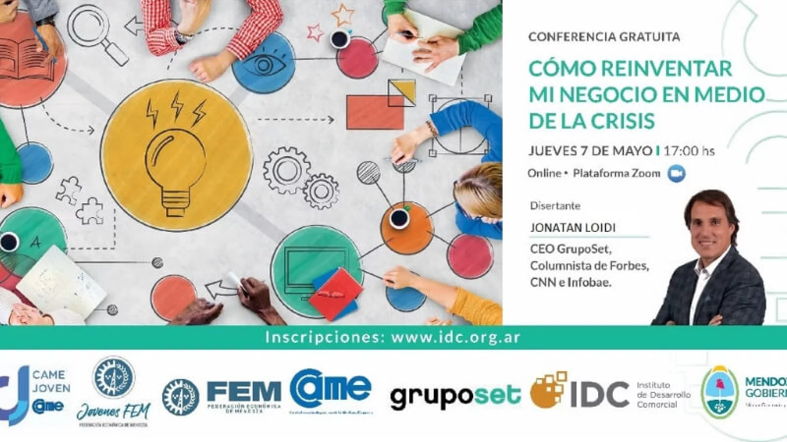 “Cómo reinventar mi negocio en medio de la crisis” se realiza hoy desde las 17 hs, a través de la plataforma de conferencias Zoom. El encuentro será gratuito y estará a cargo de Jonatan Loidi, reconocido capacitador a nivel nacional e internacional.