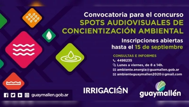 La Municipalidad de Guaymallén invita a todas las instituciones educativas primarias y secundarias del departamento a participar del concurso "Spots audiovisuales de concientización ambiental". La idea es generar un espacio de intercambio, conocimiento y retroalimentación en el que puedan compartir sus proyectos ambientales en desarrollo y contribuir al cuidado del recurso hídrico. Esto, porque la propuesta se realiza en el marco de la campaña conjunta con el Departamento General de Irrigación "La basura en el cauce vuelve, siempre vuelve", orientada a sensibilizar sobre la contaminación que provocan los residuos arrojados en ríos, cauces y acequias y cómo afectan la calidad del agua, de vida y el desarrollo sostenible de la provincia.