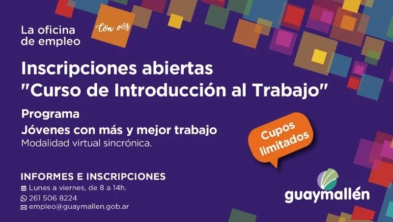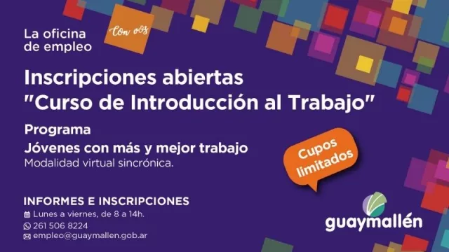 Pueden realizarse de lunes a viernes, de 8 a 14h, a través del teléfono 261 5068224 o de forma presencial en la Oficina de Empleo, ubicada en la esquina de las calles Mitre y Godoy Cruz de San José. También, los interesados podrán anotarse enviando un mail.