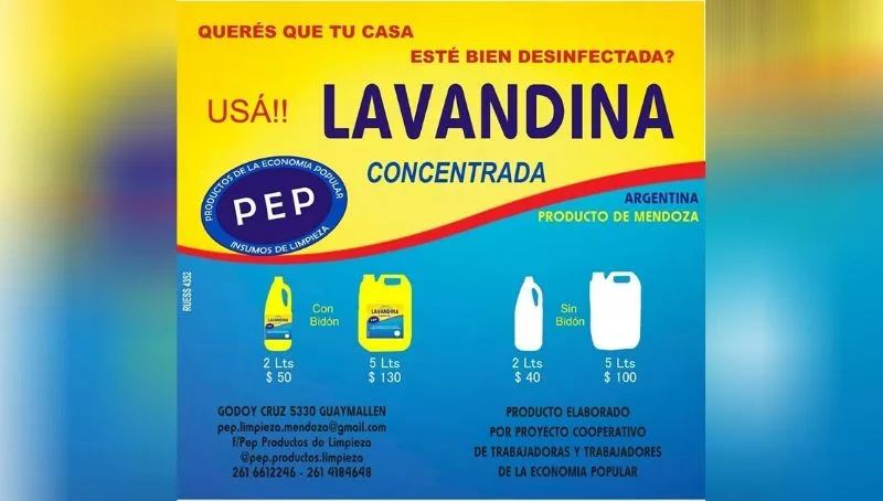 Son 16 hombres y mujeres de barrios populares de Guaymallén y de Ciudad. Bajo la marca Productos de la Economía Social (PEP), comenzaron a fabricar lavandina, guiados por un ingeniero químico, con una distribución que cubre varios puntos del Gran Mendoza y hacen envíos también a otros departamentos de la provincia.